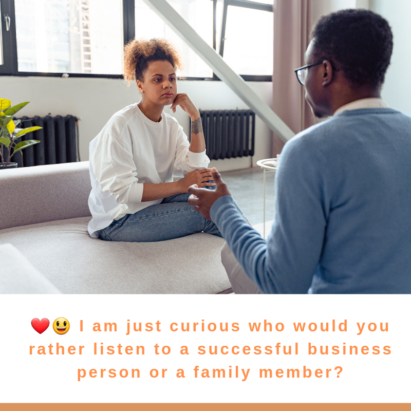 ❤😃 I am just curious who would you rather listen to a successful business person or a family member?