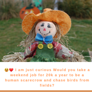 😃❤️ I am just curious Would you take a weekend job for 20k a year to be a human scarecrow and chase birds from fields?