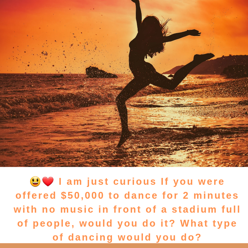 😃❤️ I am just curious If you were offered $50,000 to dance for 2 minutes with no music in front of a stadium full of people, would you do it? What type of dancing would you do?