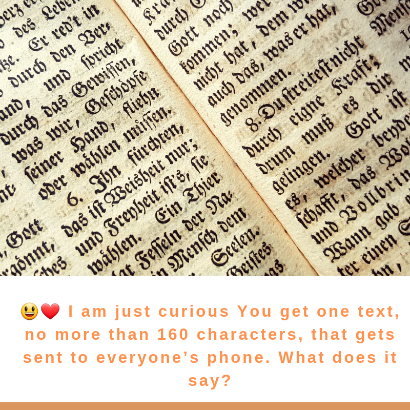 😃❤️ I am just curious You get one text, no more than 160 characters, that gets sent to everyone’s phone. What does it say?