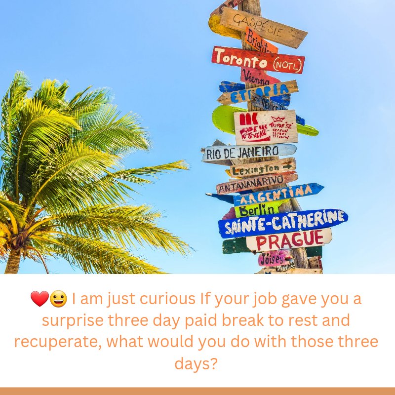 ❤️😀 I am just curious If your job gave you a surprise three day paid break to rest and recuperate, what would you do with those three days?