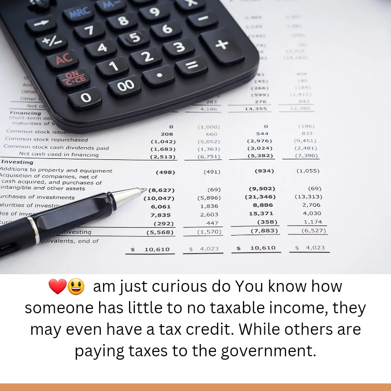 ❤️😃 am just curious do You know how someone has little to no taxable income, they may even have a tax credit. While others are paying taxes to the government.