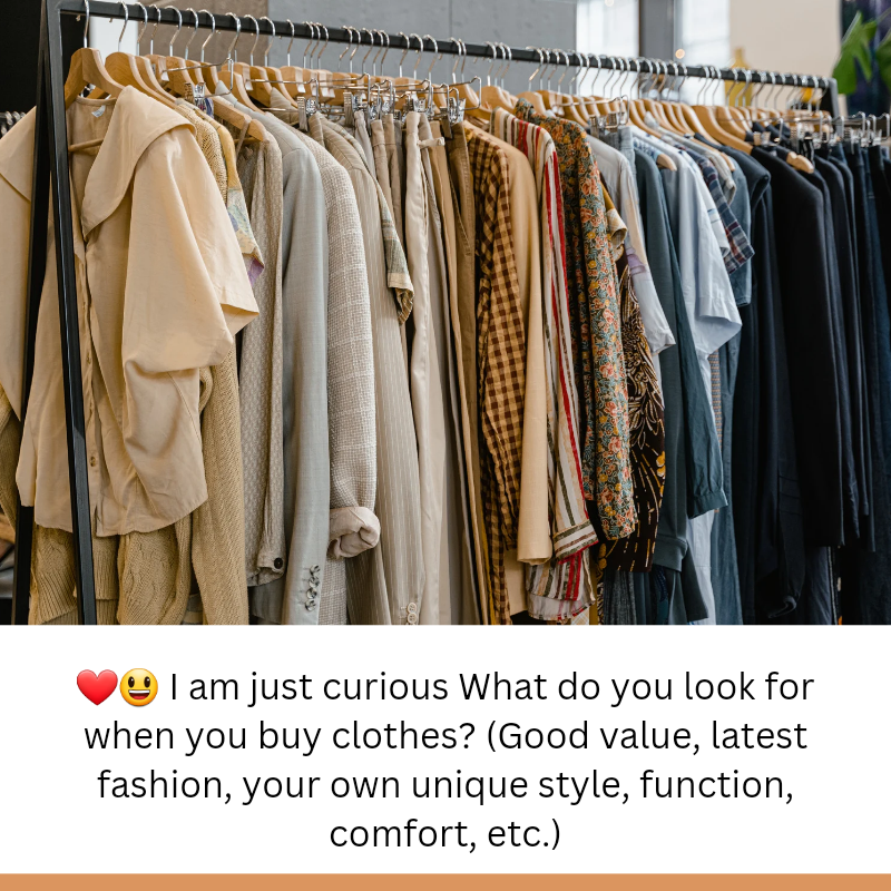 ❤️😃 I am just curious What do you look for when you buy clothes? (Good value, latest fashion, your own unique style, function, comfort, etc.)