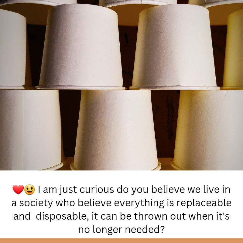 ❤️😃 I am just curious do you believe we live in a society who believe everything is replaceable and disposable, it can be thrown out when it's no longer needed?