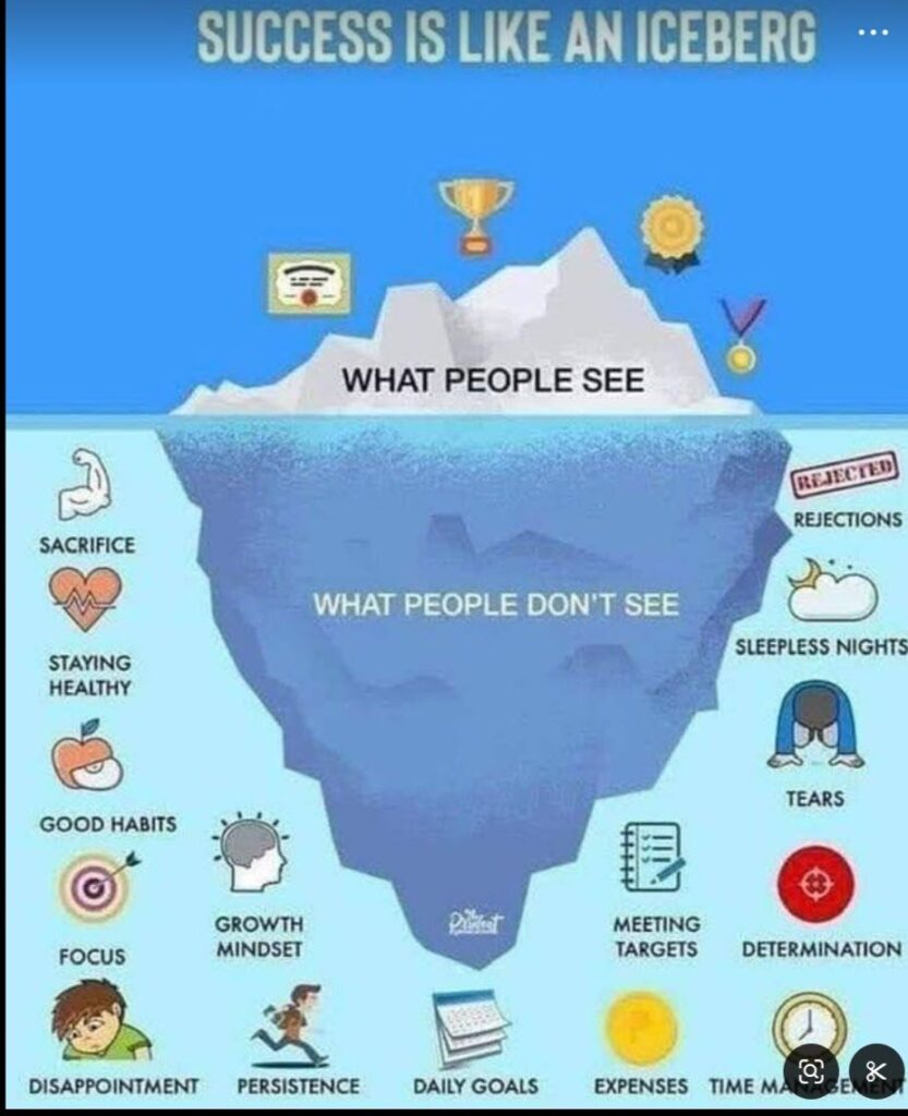 ❤️👨👩👧👦🏃♂️ So very true about success. It is definitely like a iceberg, alot is built on the underneath in the tough times to help You become strong enough for Your success. Its facing it all and keeping on going no matter what.