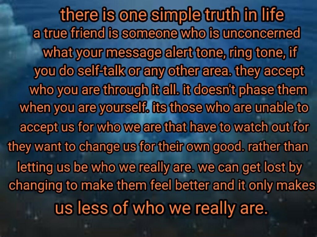 👨👩👧👦❤️👩❤️👩 A very important truth. There is one simple truth in life a true friend is someone who is unconcerned what your message alert tone, ring tone, if you do self-talk or any other area. they accept who you are through it all. it doesn't phase them when you are yourself. its those who are unable to accept us for who we are that have to watch out for they want to change us for their own good. rather than letting us be who we really are. we can get lost by changing to make them feel better and it only makes us less of who we really are.
