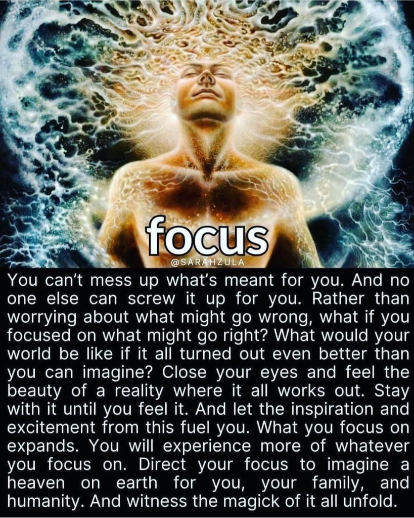 "What you focus on expands. You will experience more of whatever you focus on. Direct your focus to imagine a heaven on earth for you, your family, and humanity. And witness the magick of it all unfold."