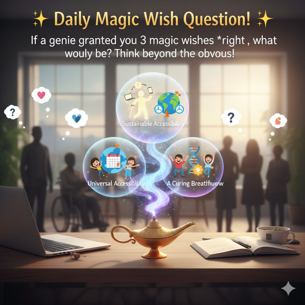✨ Daily Magic Wish Question! ✨ If a genie granted you 3 magic wishes right now, what would they be? 🧞♀️ Think beyond the obvious! As someone navigating the world of network marketing with chronic conditions, my wishes would definitely revolve around: * Sustainable Energy: The ability to consistently have the physical and mental stamina needed to build my business, serve my team, and manage my health without burnout. * Universal Accessibility: A world where every tool, platform, event, and opportunity is truly inclusive and accessible for everyone, regardless of their physical abilities. * A Curing Breakthrough: For a definitive cure or highly effective management strategy for chronic conditions, not just for myself, but for the millions who suffer daily. Now, it's YOUR turn! If you had 3 wishes to impact your life, health, business, or family, what would you ask for? Share your magic! 👇