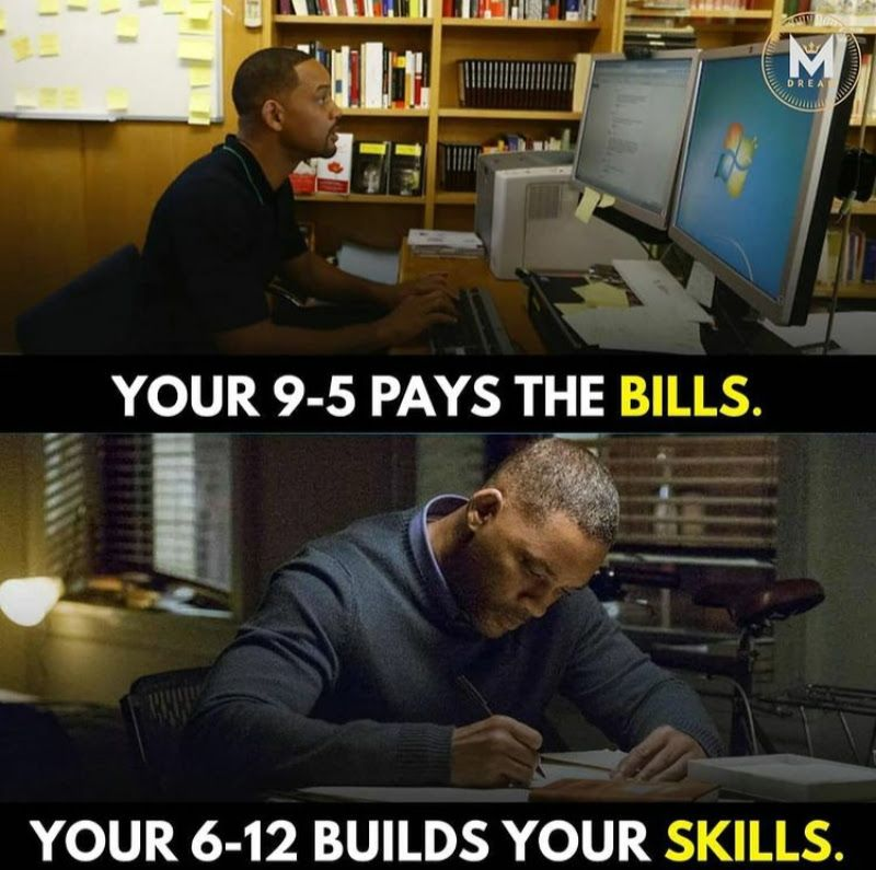 "Your 9-5 keeps the lights on, but your 6-12 lights up your future. ✨ It's not just about earning a living; it's about relentlessly investing in yourself, honing your skills, and building the foundation for the life you truly desire. What are you building after hours?